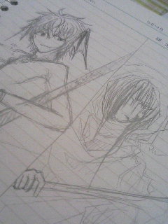 そしてゆっくり休んだ後に3時限目に行って漢字テストで惨敗して、睡魔によって意識を朦朧とさせられてる中描いたのは、金曜TRPG「アリアンロッド」参戦中のアカネ。と、師匠のクレナイ。