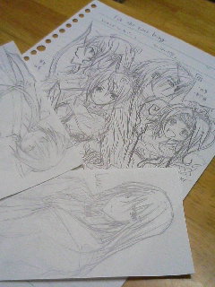 手前の小さな紙2枚は授業中に描いたもの(ヲイ)、B5のルーズリーフが空き時間に描いたものです。